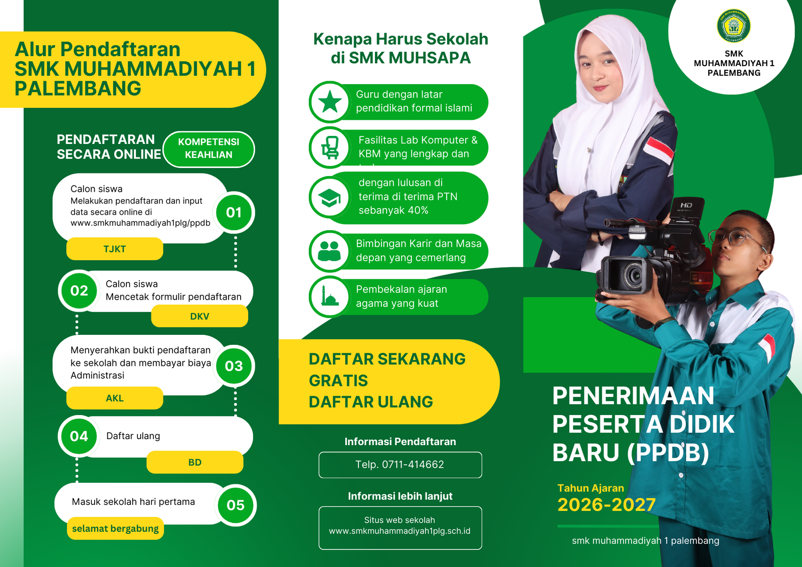 SMK MUHAMMADIYAH 1 PALEMBANG menyediakan PPDB secara online diharapkan proses PPDB dapat berjalan cepat dan bisa dilakukan dimanapun dan kapanpun selama sesi PPDB Online dibuka. SMK MUHAMMADIYAH 1 PALEMBANG.